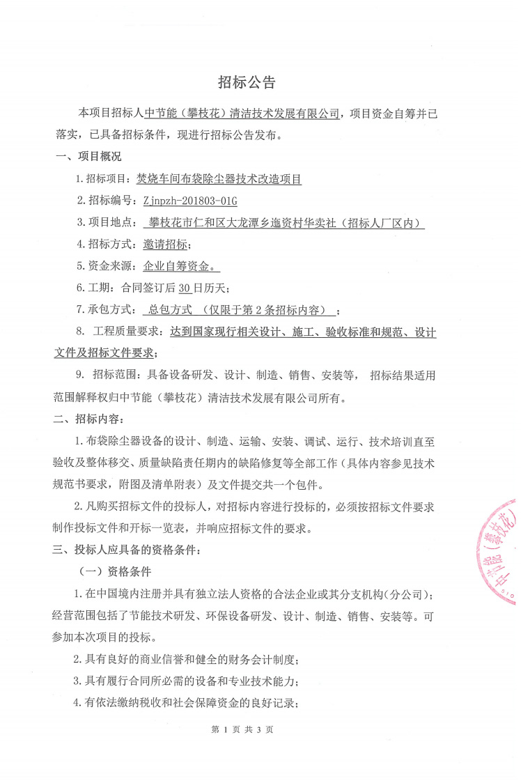 焚燒車間布袋除塵器技術(shù)改造項目招標公告