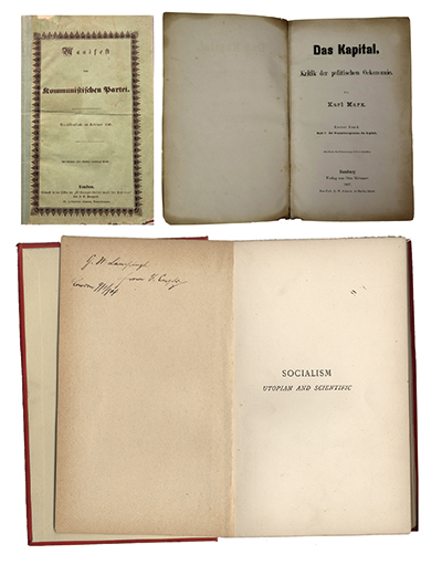 左上圖為1848年《共產(chǎn)黨宣言》德文第一版。右上圖為1867年《資本論》德文第1卷第一版。下圖為恩格斯的題字贈書《社會主義從空想到科學(xué)的發(fā)展》,1892年英文版。 中央黨史和文獻(xiàn)研究院供圖