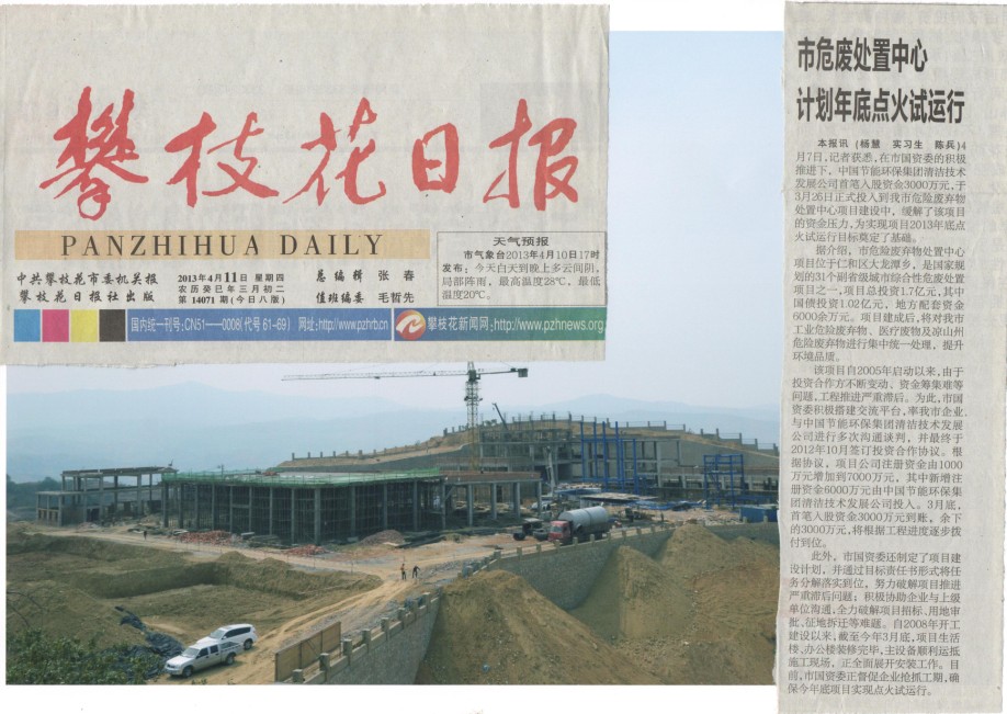 2013年4月11日攀枝花日?qǐng)?bào)以“市危廢處置中心計(jì)劃年底點(diǎn)火試運(yùn)行”為題報(bào)道了危廢中心建設(shè)情況。